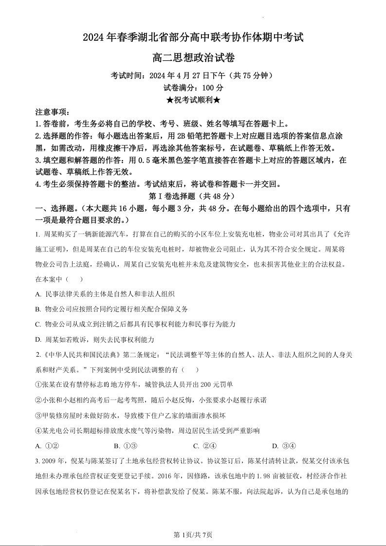 湖北省部分高中联考协作体2023-2024学年高二下学期期中考试政治(原卷版)