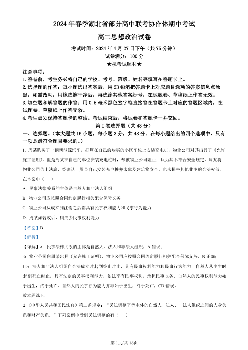 湖北省部分高中联考协作体2023-2024学年高二下学期期中考试政治(精品解析版)