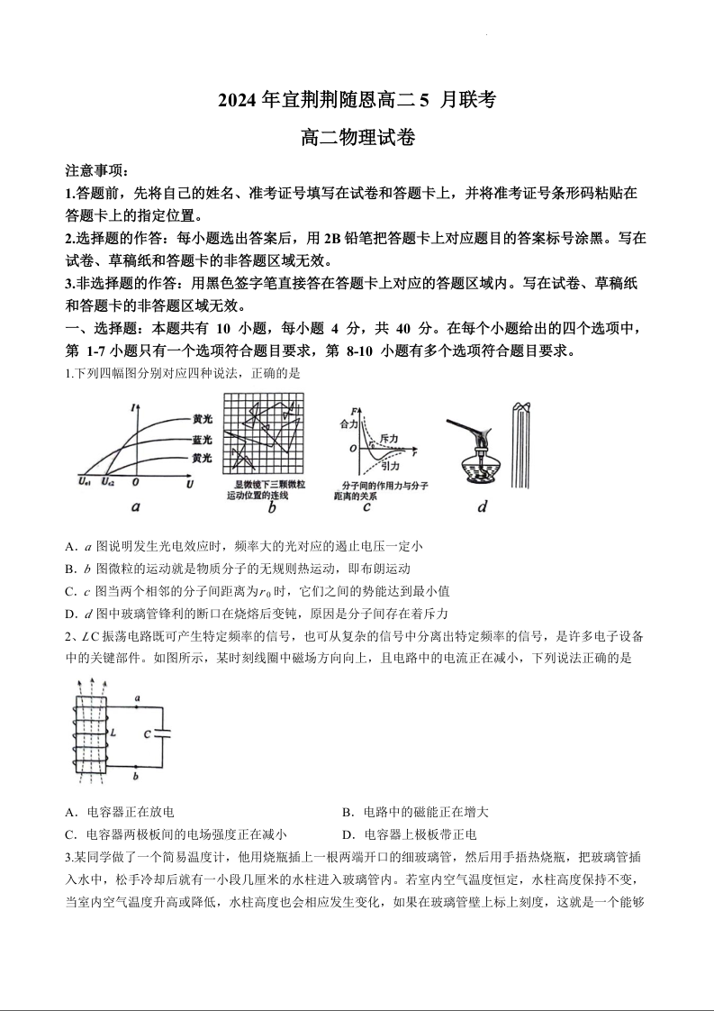 湖北省宜昌、荆州、荆随州、恩施名校协作体2023-2024学年高二下学期5月联考物理+答案