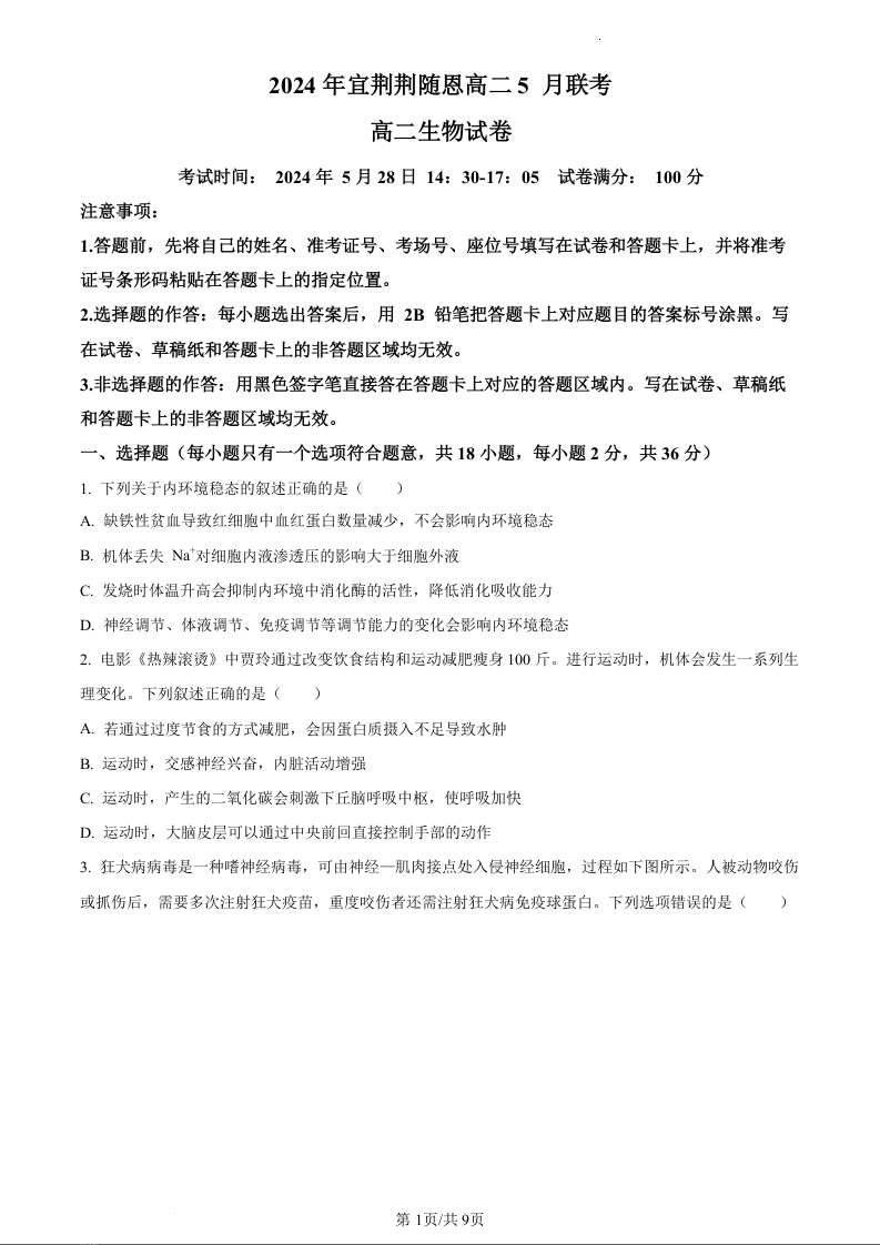 湖北省宜昌、荆州、荆随州、恩施名校协作体2023-2024学年高二下学期5月联考生物(原卷版)