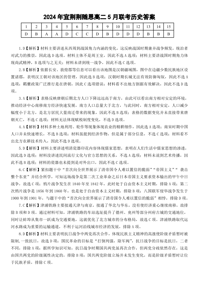 湖北省宜昌、荆州、荆随州、恩施名校协作体2023-2024学年高二下学期5月联考历史答案