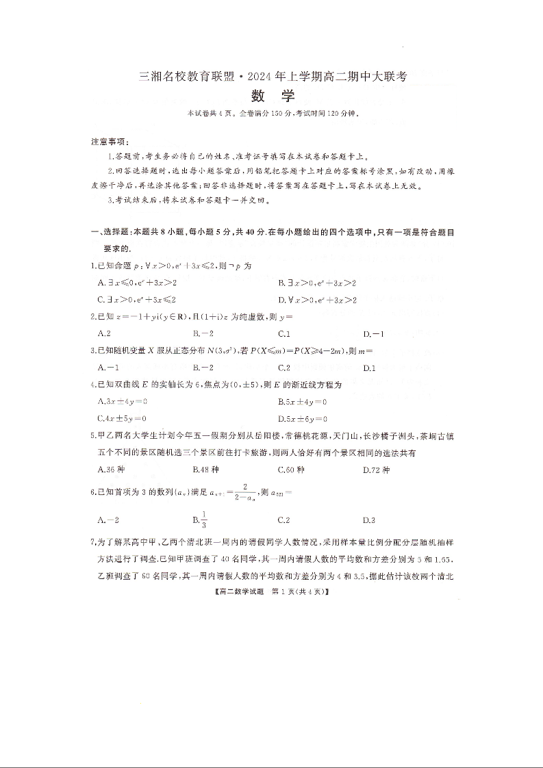 湖南省三湘名校教育联盟2023-2024学年高二下学期期中考试数学