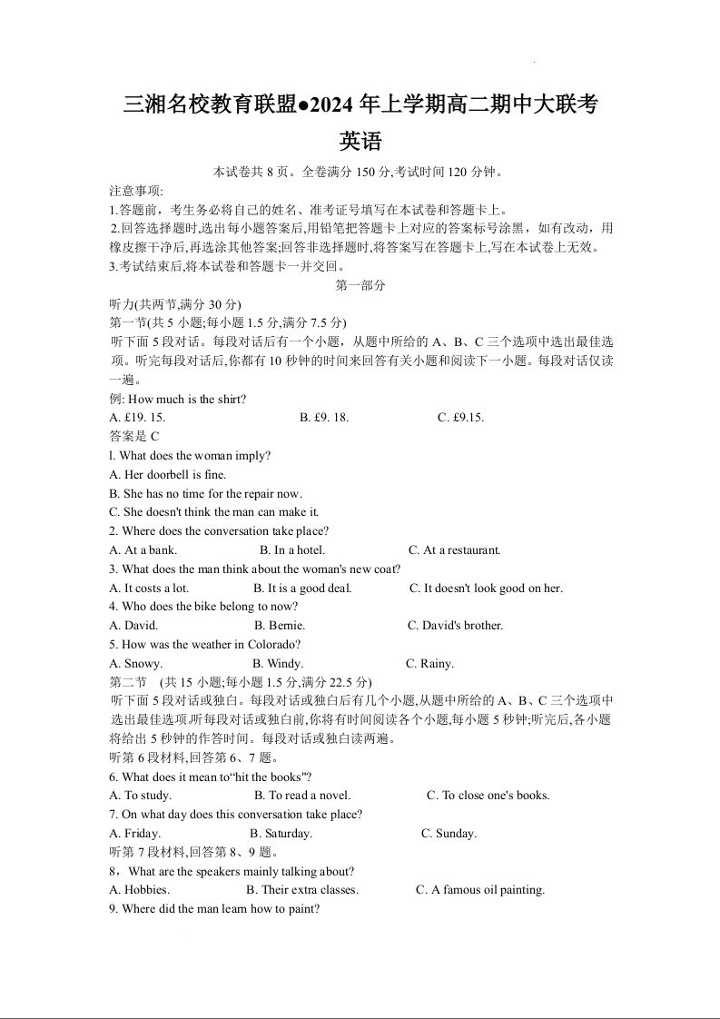 湖南省三湘名校教育联盟2023-2024学年高二下学期期中考试英语