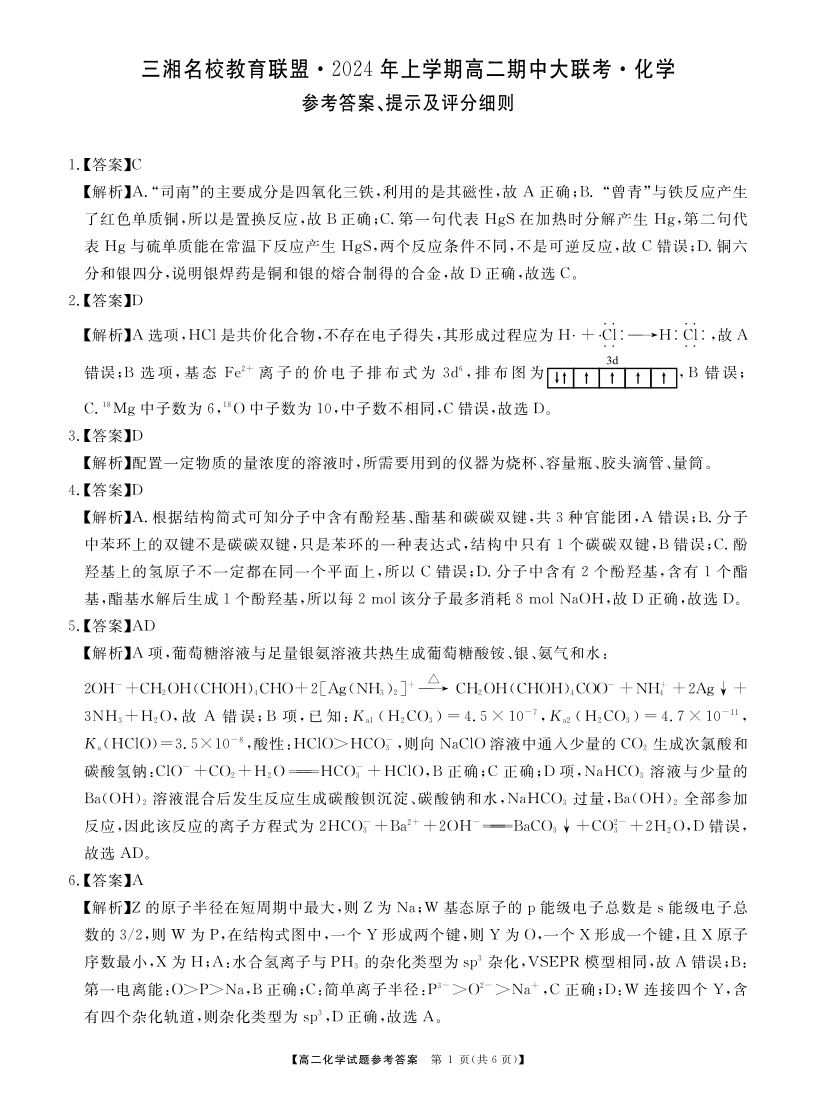 湖南省三湘名校教育联盟2023-2024学年高二下学期期中考试化学答案