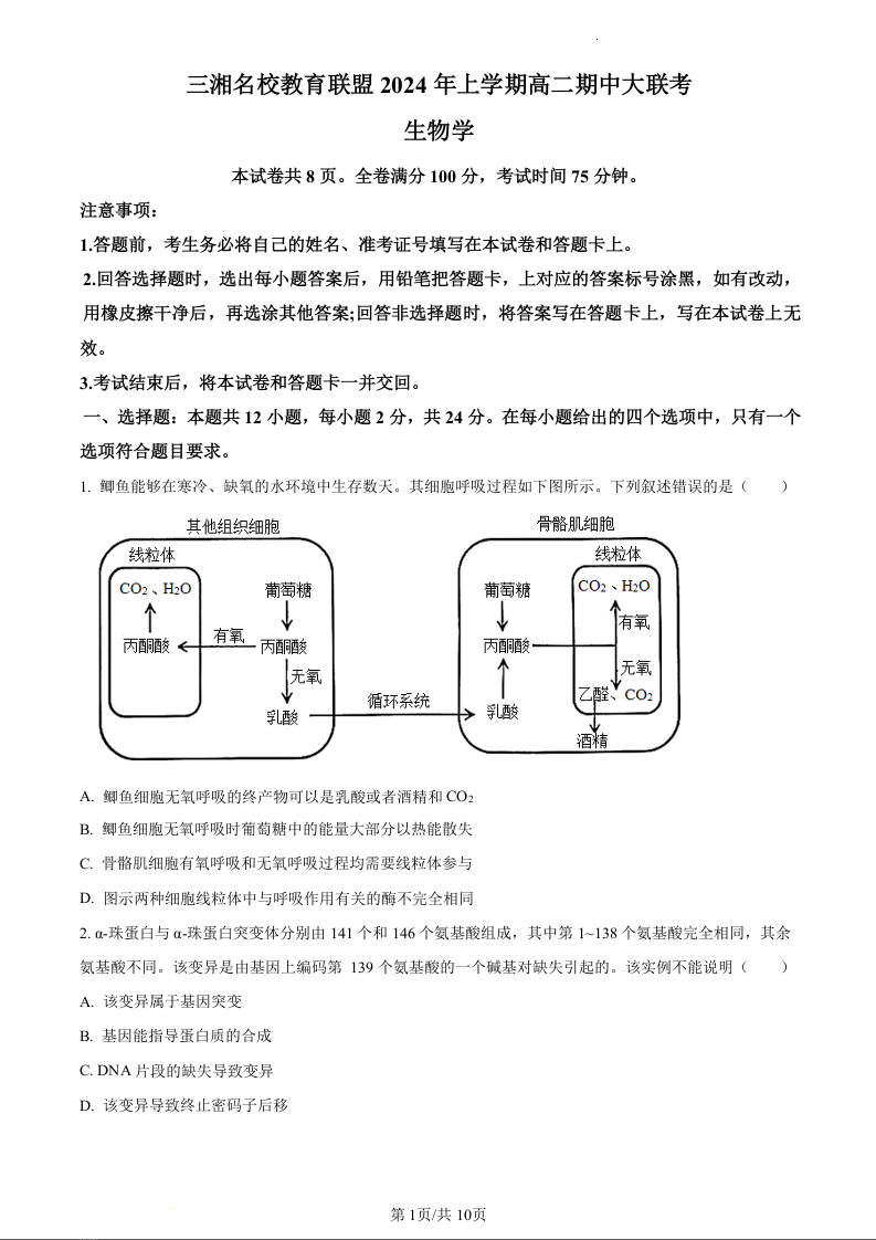 湖南省三湘名校教育联盟2023-2024学年高二下学期期中考试生物(原卷版)