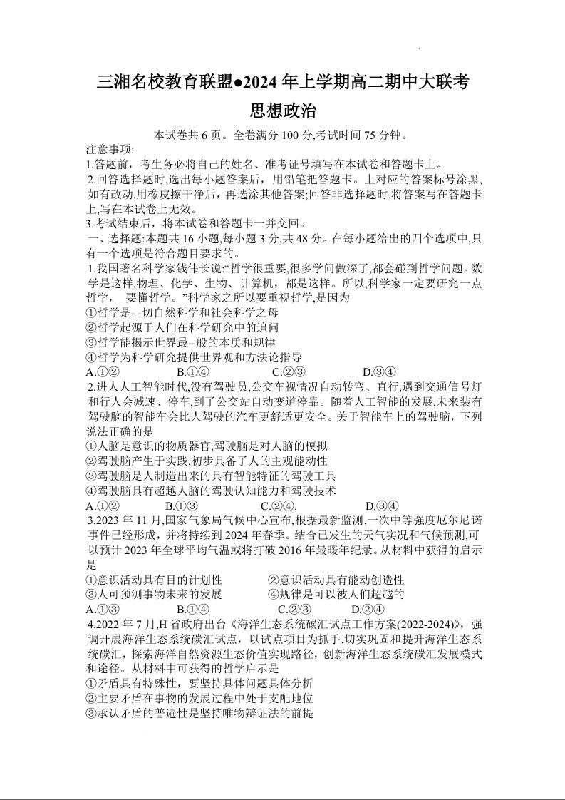 湖南省三湘名校教育联盟2023-2024学年高二下学期期中考试政治