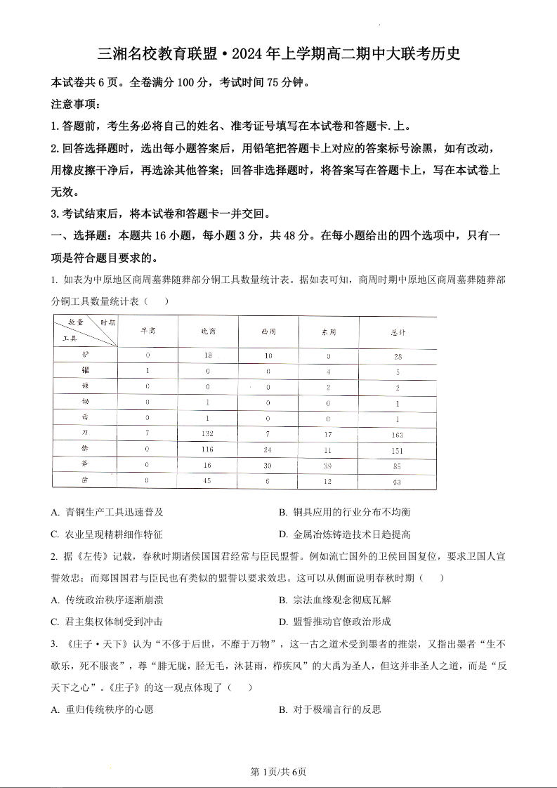 湖南省三湘名校教育联盟2023-2024学年高二下学期期中考试历史(原卷版)