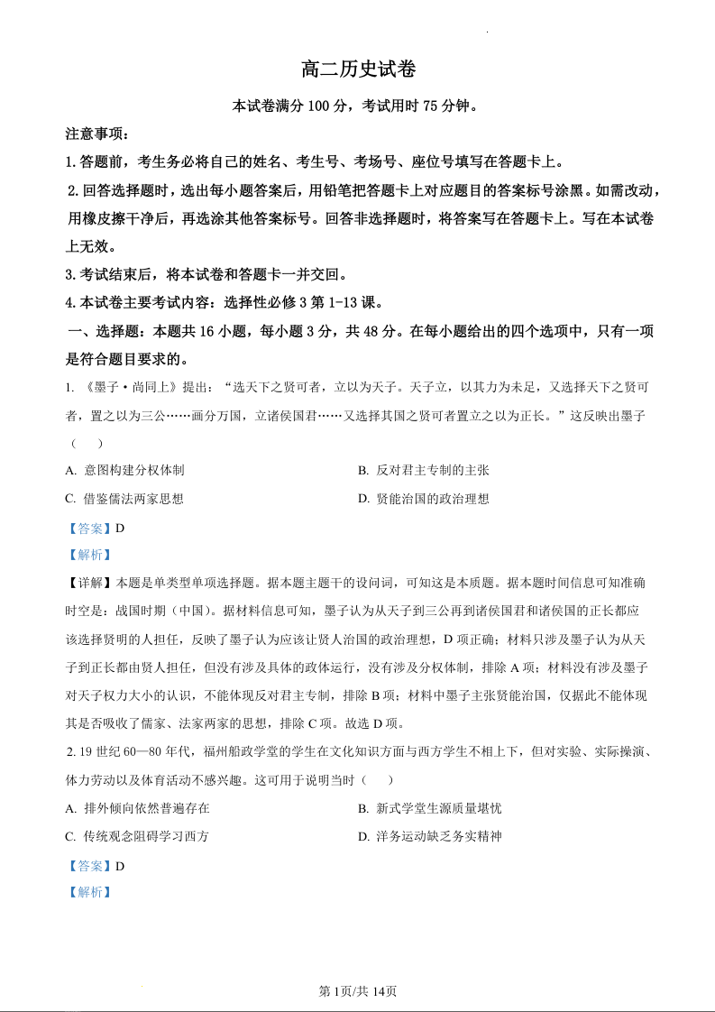 吉林省BEST合作体”2023-2024学年高二下学期5月期中考试历史(精品解析版)