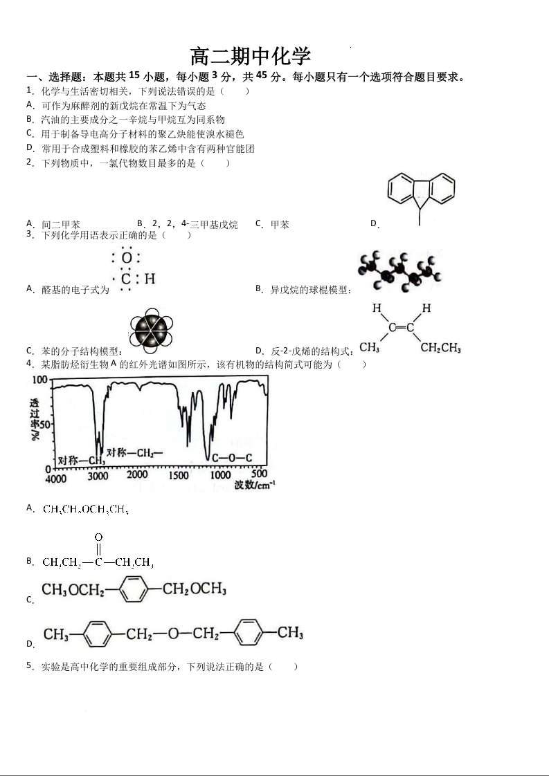 吉林省梅河口市第五中学2023-2024学年高二下学期5月期中考试化学+答案