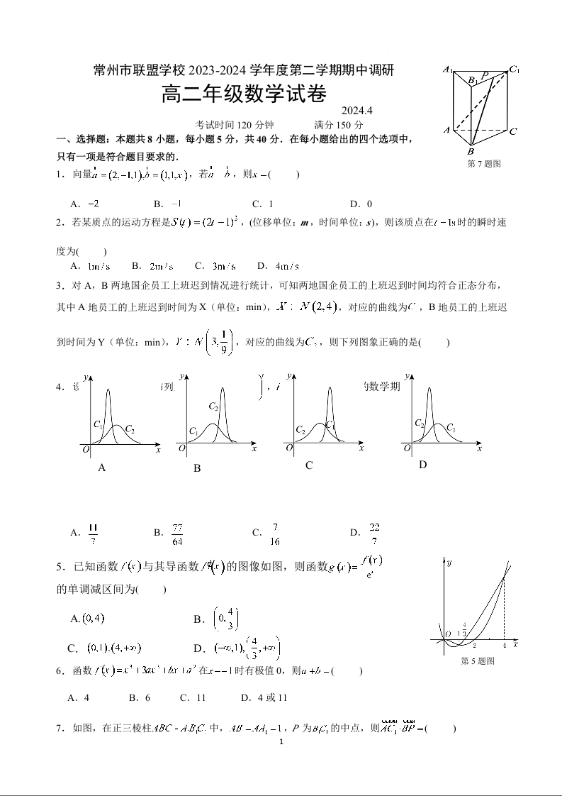 江苏省常州市联盟校2023-2024学年高二下学期4月期中考试数学