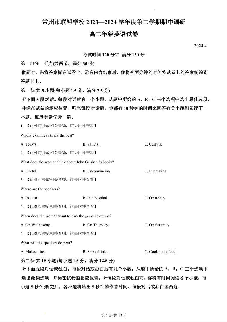 江苏省常州市联盟校2023-2024学年高二下学期4月期中考试英语(原卷版)