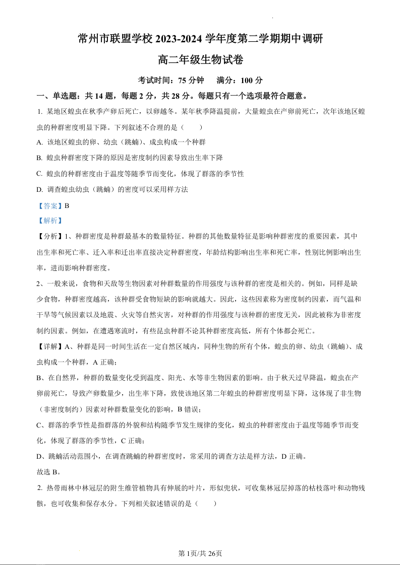 江苏省常州市联盟校2023-2024学年高二下学期4月期中考试生物(精品解析版)