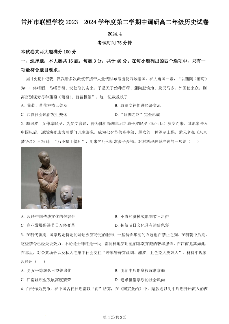 江苏省常州市联盟校2023-2024学年高二下学期4月期中考试历史(原卷版)
