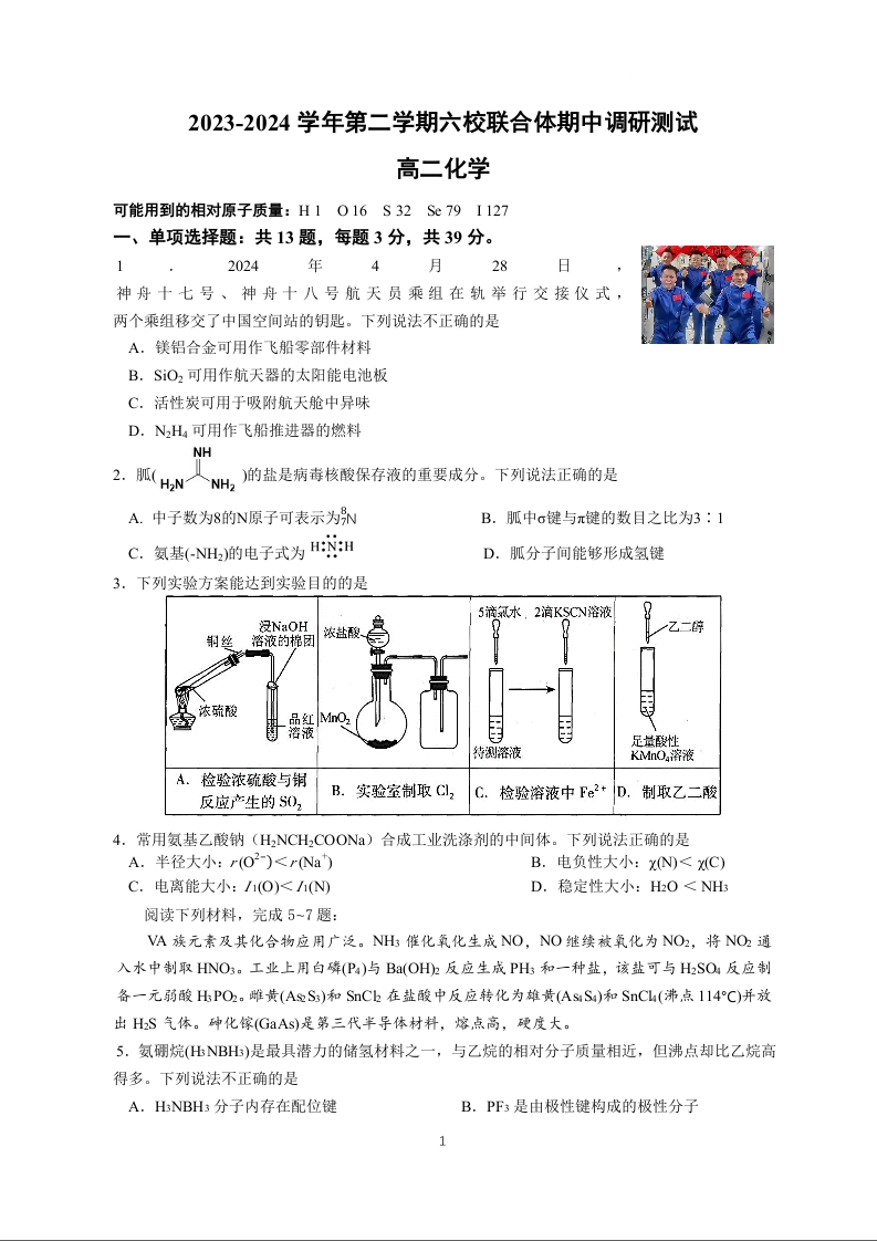 江苏省南京市六校联合体2023-2024学年高二下学期5月月考化学