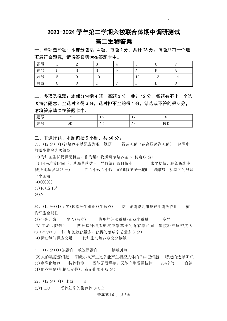 江苏省南京市六校联合体2023-2024学年高二下学期5月月考生物答案