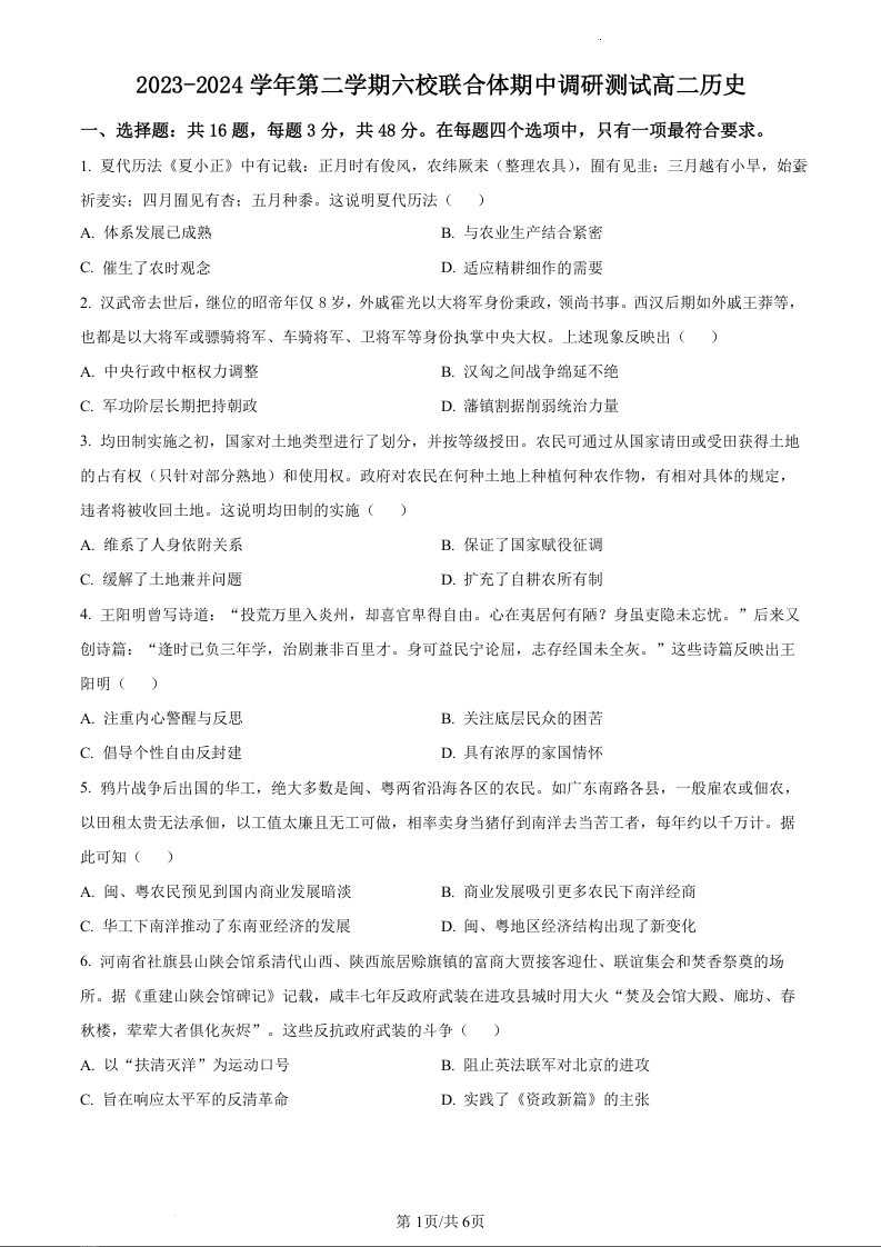 江苏省南京市六校联合体2023-2024学年高二下学期5月月考历史(原卷版)