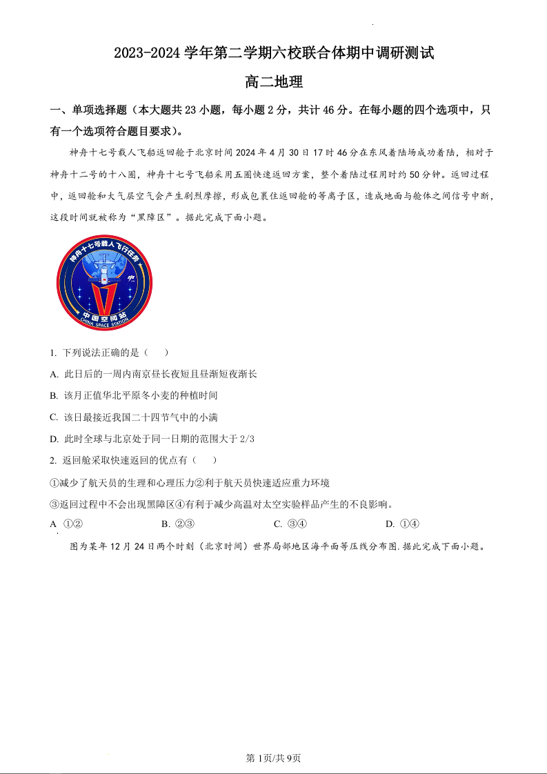 江苏省南京市六校联合体2023-2024学年高二下学期5月月考地理(原卷版)