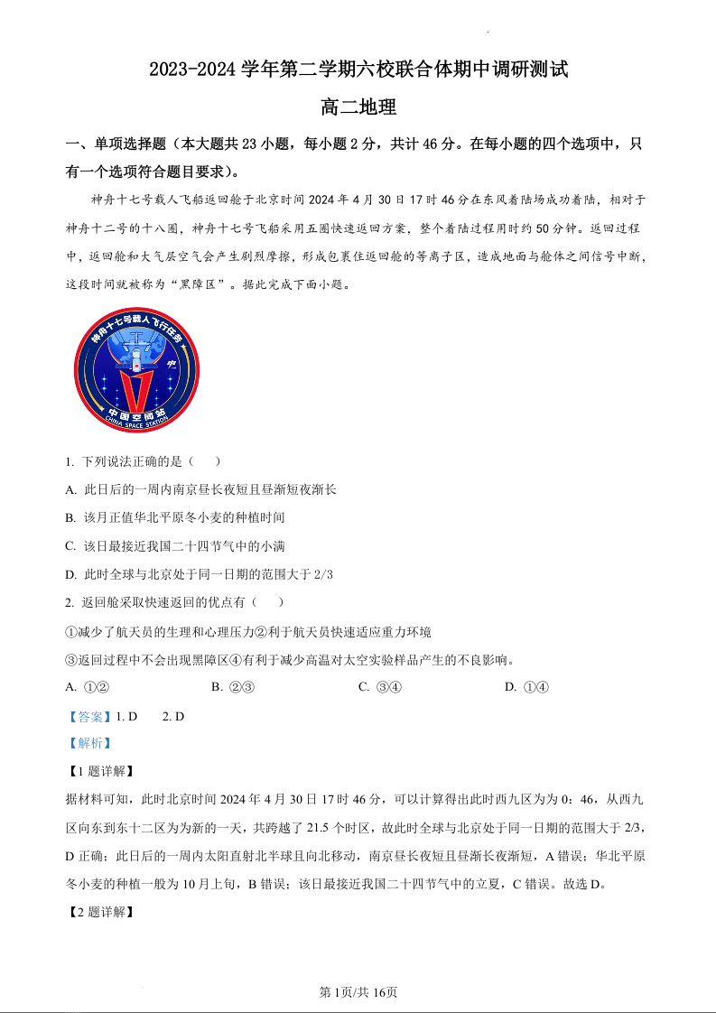 江苏省南京市六校联合体2023-2024学年高二下学期5月月考地理(精品解析版)