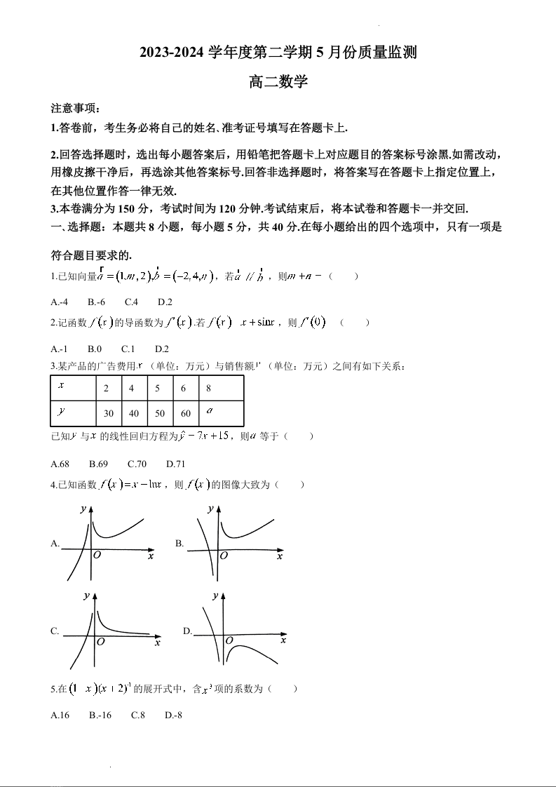 江苏省南通市2023-2024学年高二下学期期中考试数学