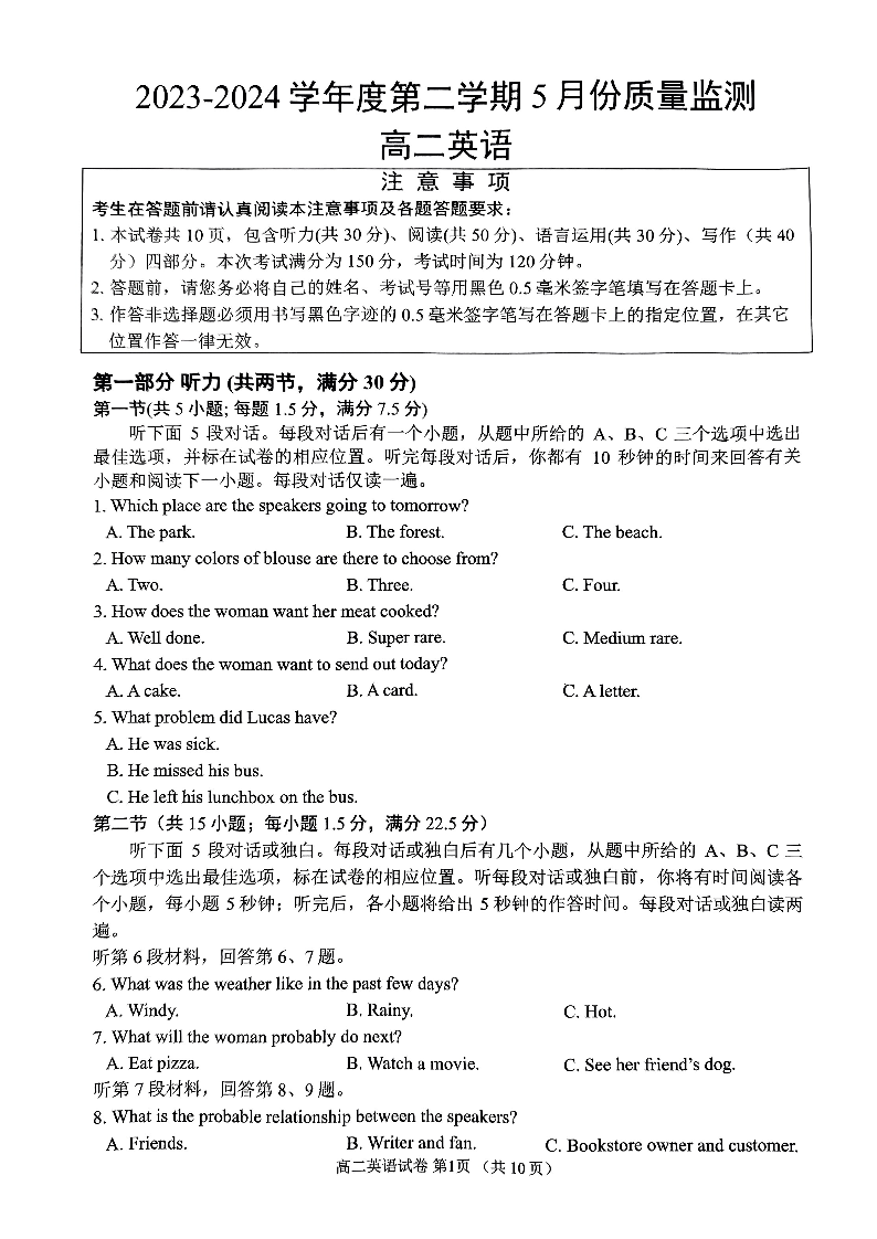 江苏省南通市2023-2024学年高二下学期期中考试英语