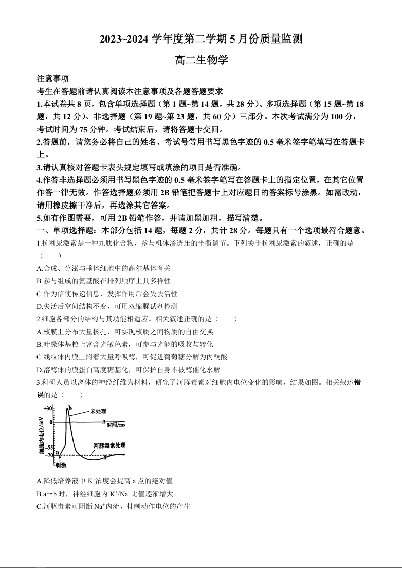 江苏省南通市2023-2024学年高二下学期期中考试生物