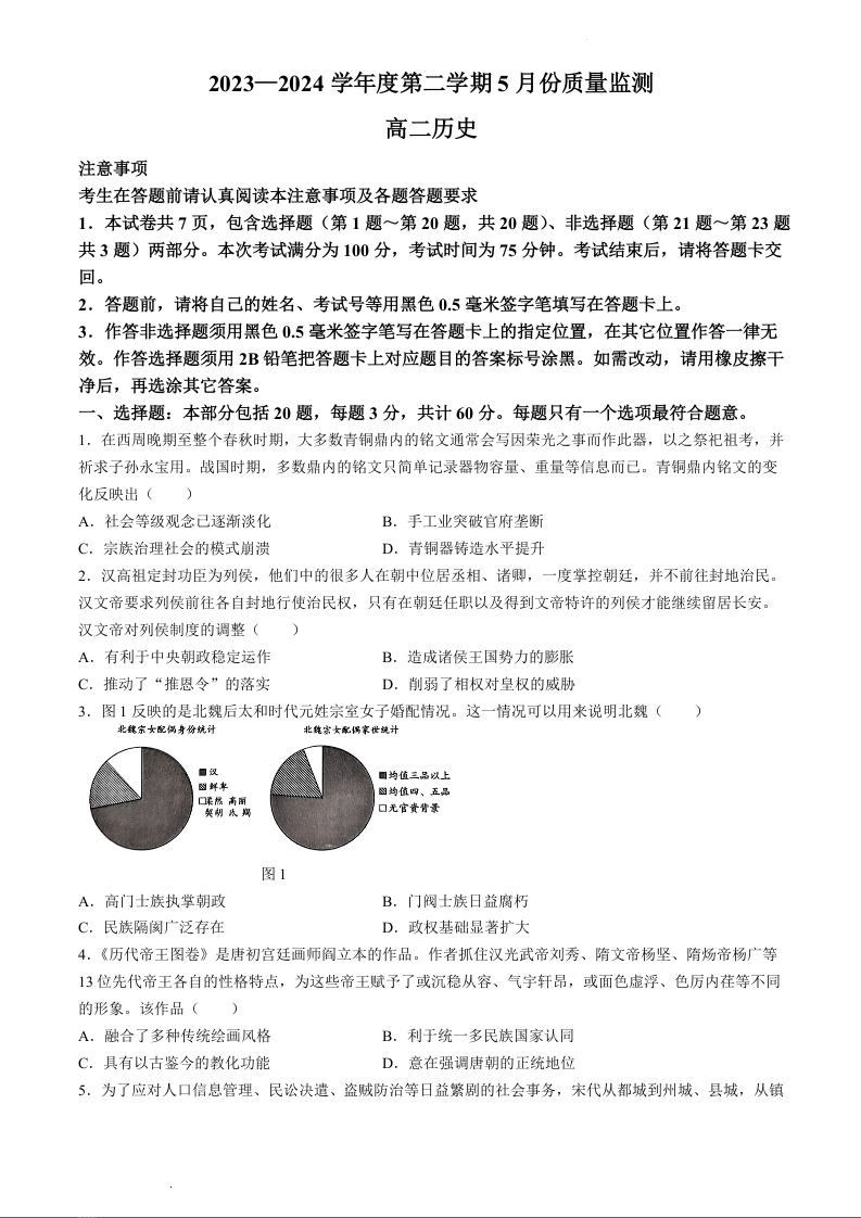 江苏省南通市2023-2024学年高二下学期期中考试历史+答案