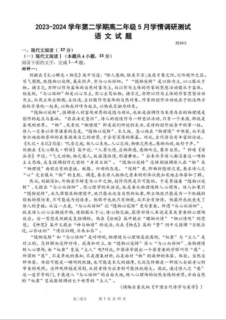 江苏省扬州市高邮市2023-2024学年高二下学期5月月考语文+答案