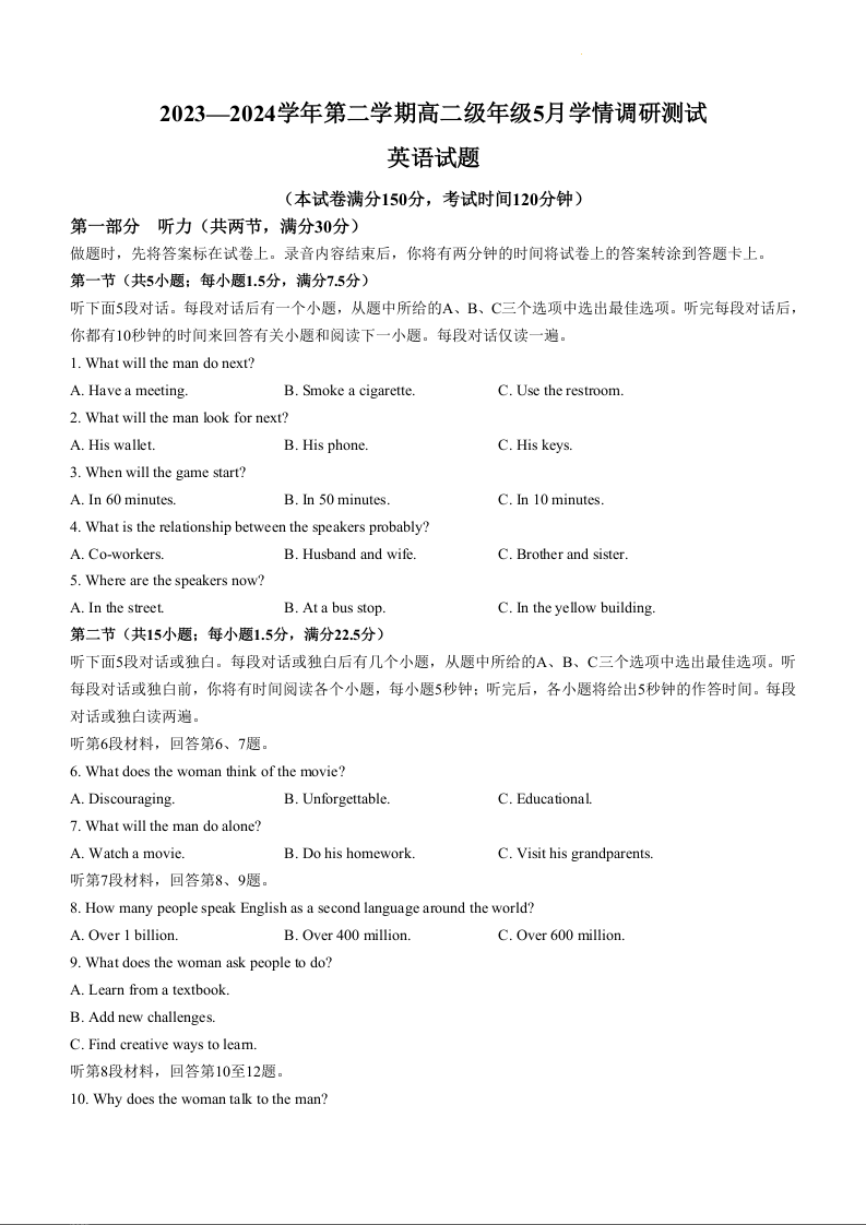 江苏省扬州市高邮市2023-2024学年高二下学期5月月考英语+答案