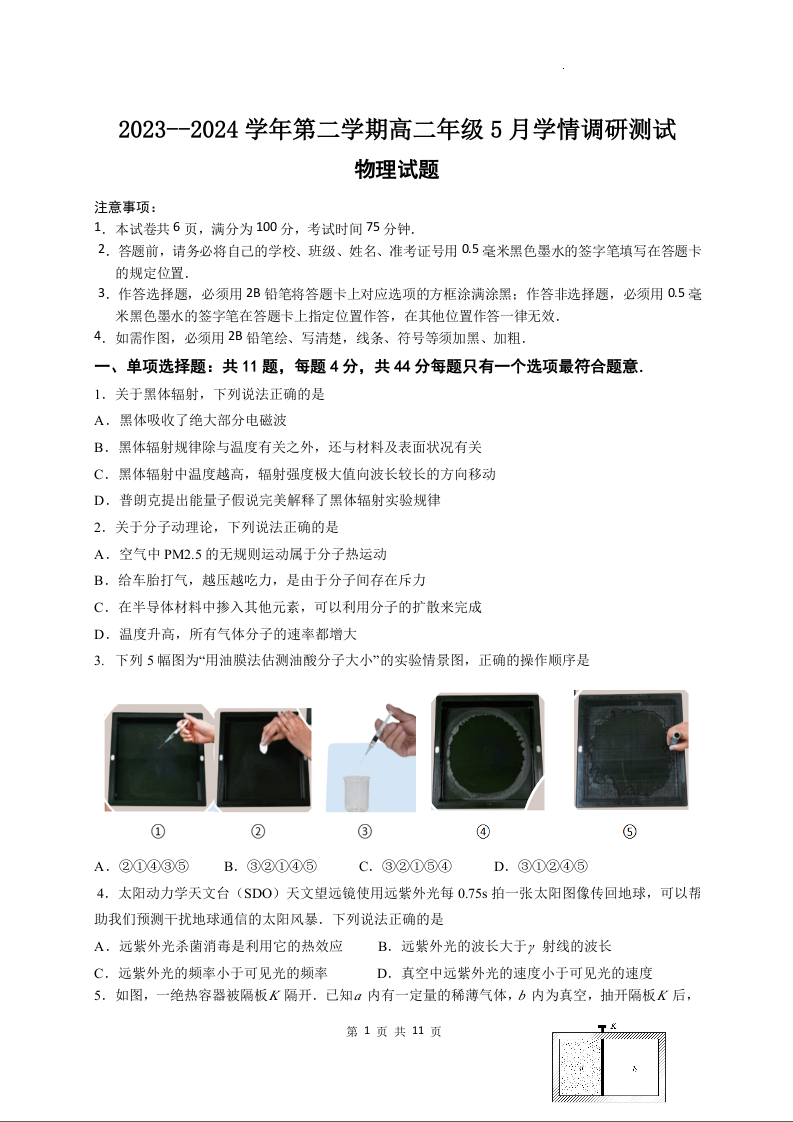 江苏省扬州市高邮市2023-2024学年高二下学期5月月考物理+答案