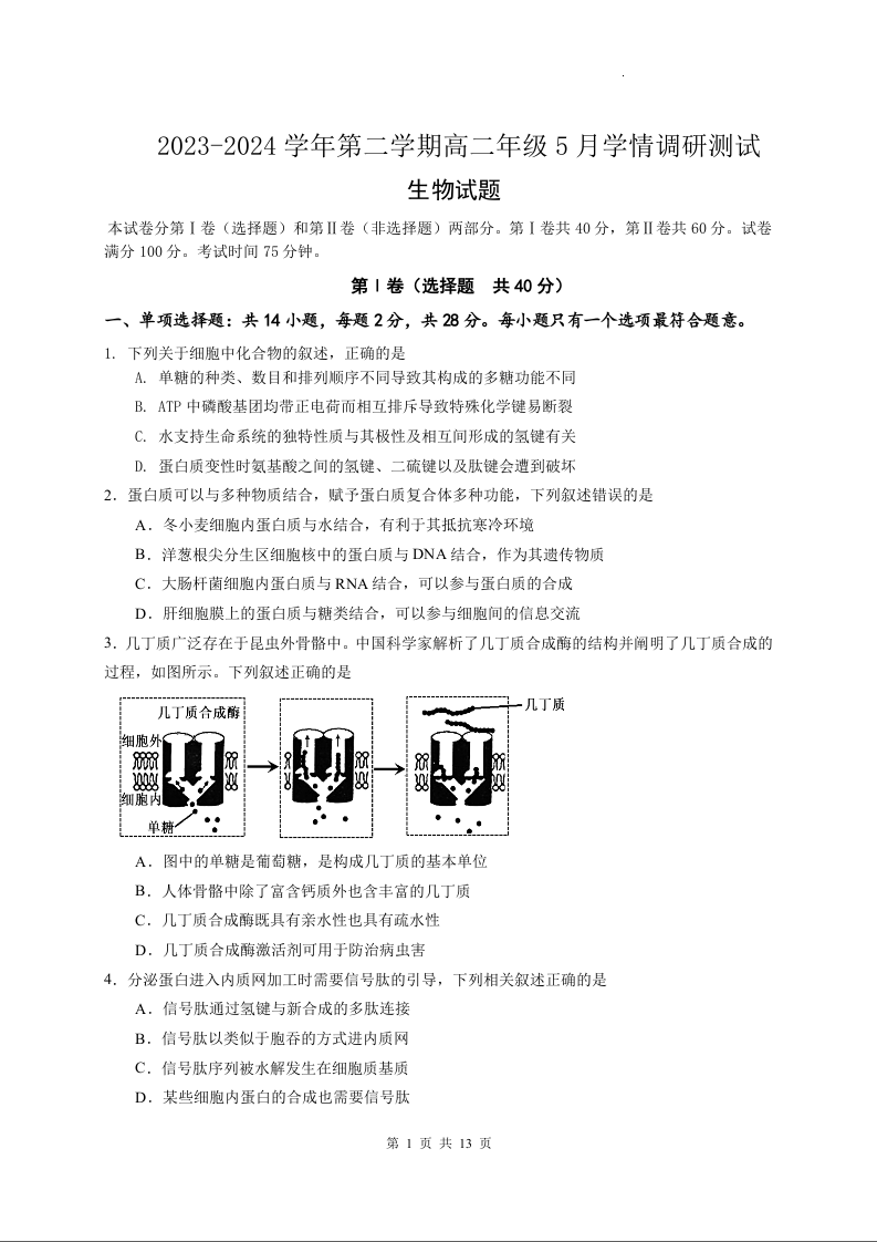 江苏省扬州市高邮市2023-2024学年高二下学期5月月考生物+答案