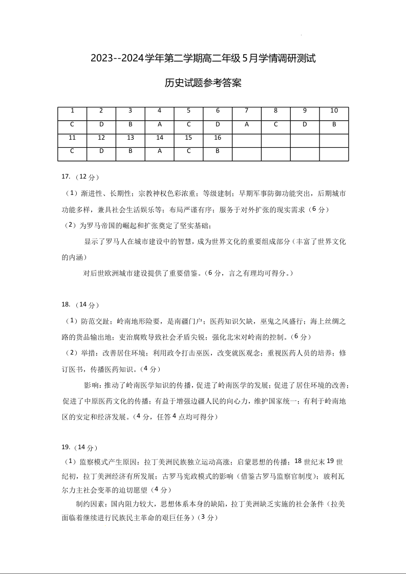 江苏省扬州市高邮市2023-2024学年高二下学期5月月考历史答案