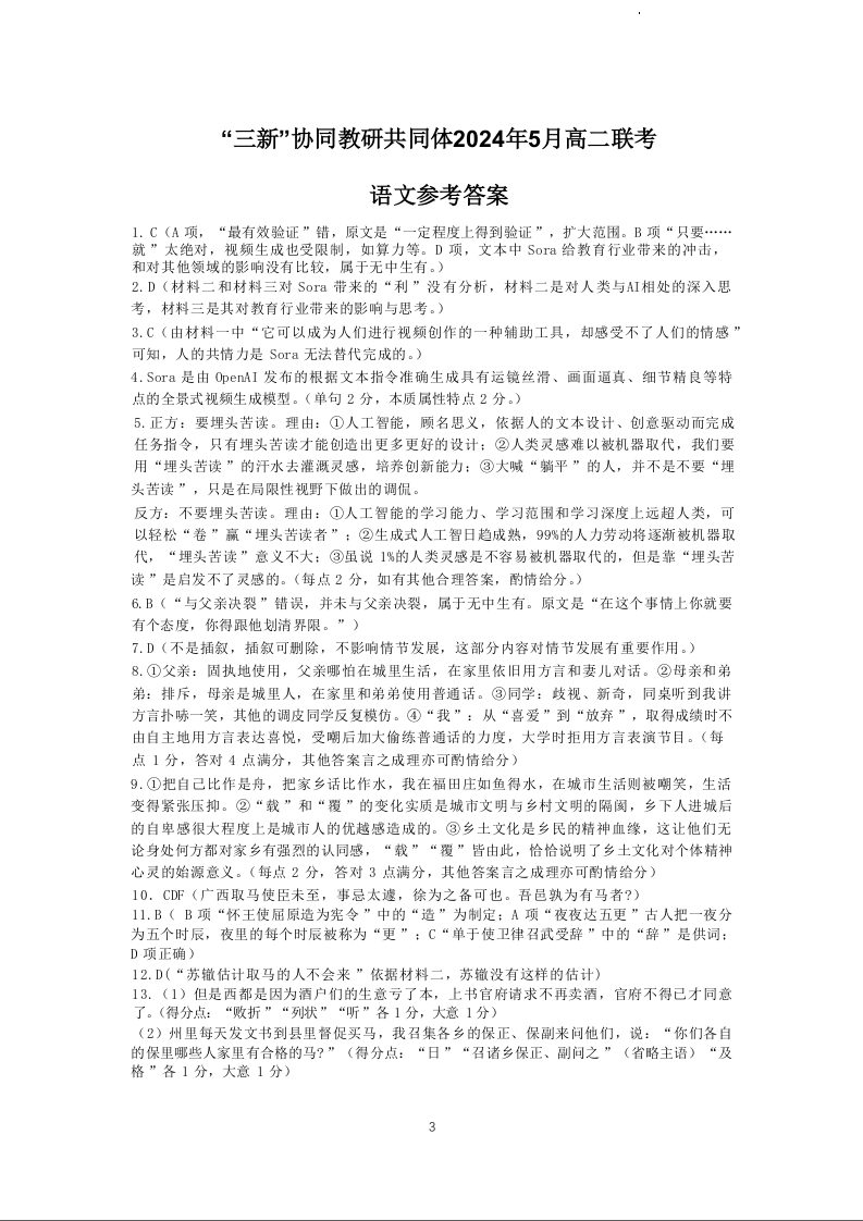 江西省三新协作体2023-2024学年高二下学期5月月考语文答案