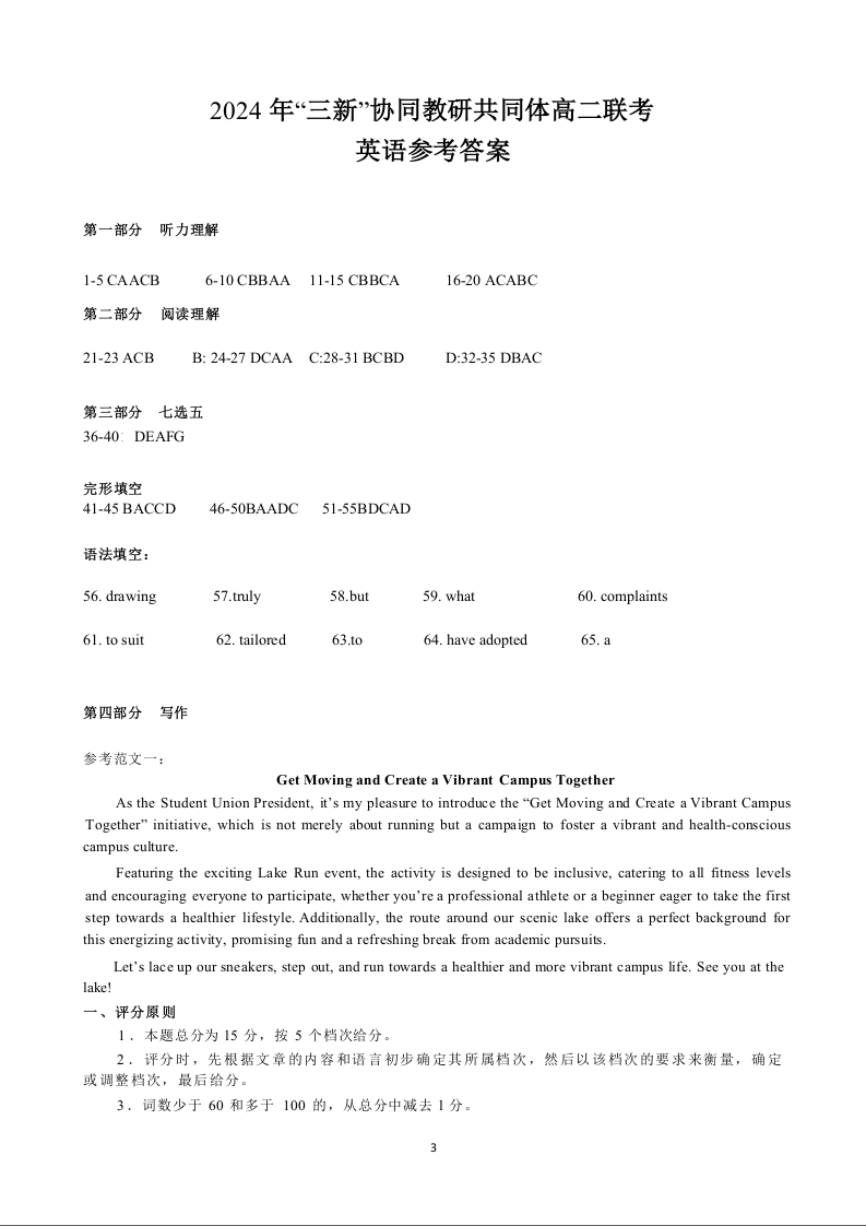 江西省三新协作体2023-2024学年高二下学期5月月考英语答案