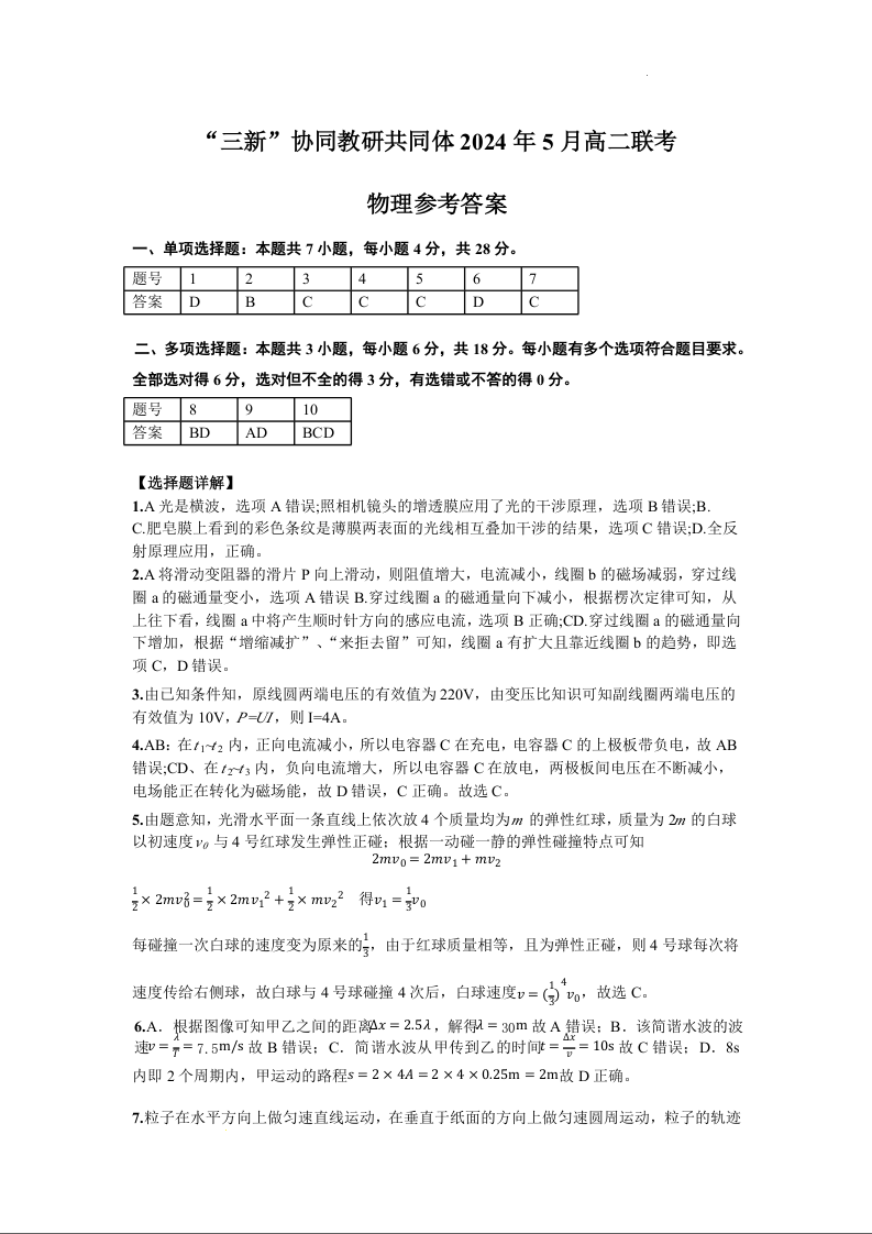 江西省三新协作体2023-2024学年高二下学期5月月考物理答案