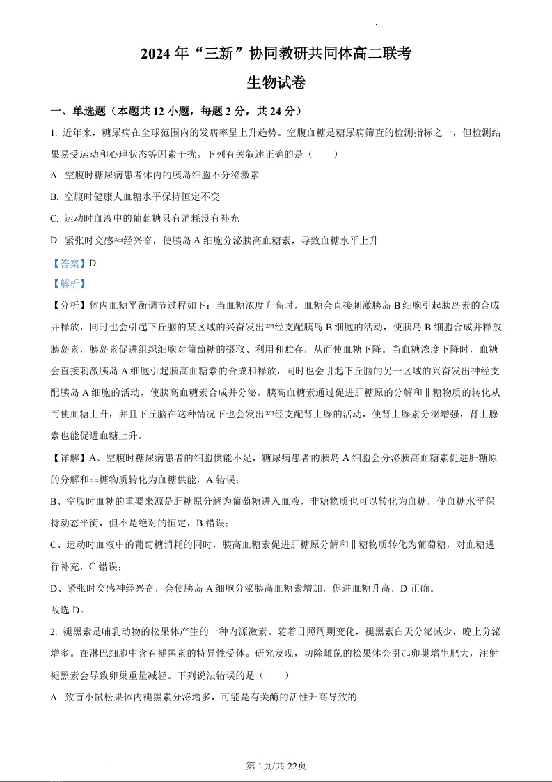 江西省三新协作体2023-2024学年高二下学期5月月考生物(精品解析版)