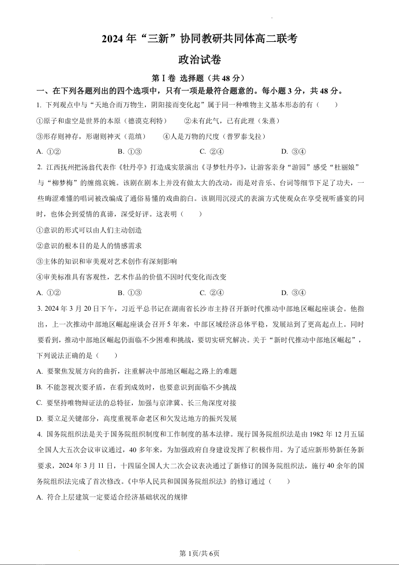 江西省三新协作体2023-2024学年高二下学期5月月考政治(原卷版)