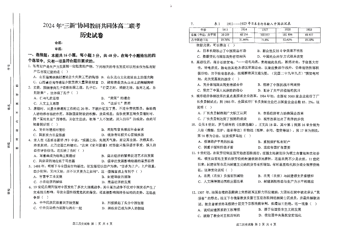江西省三新协作体2023-2024学年高二下学期5月月考历史