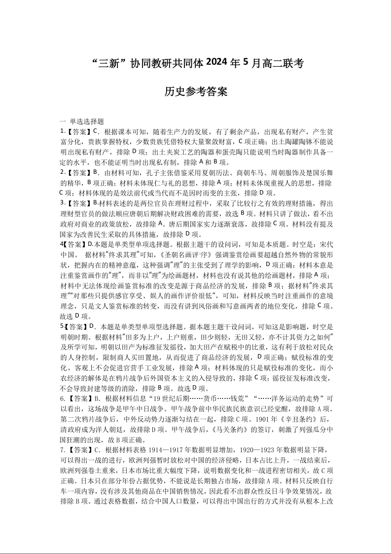 江西省三新协作体2023-2024学年高二下学期5月月考历史答案
