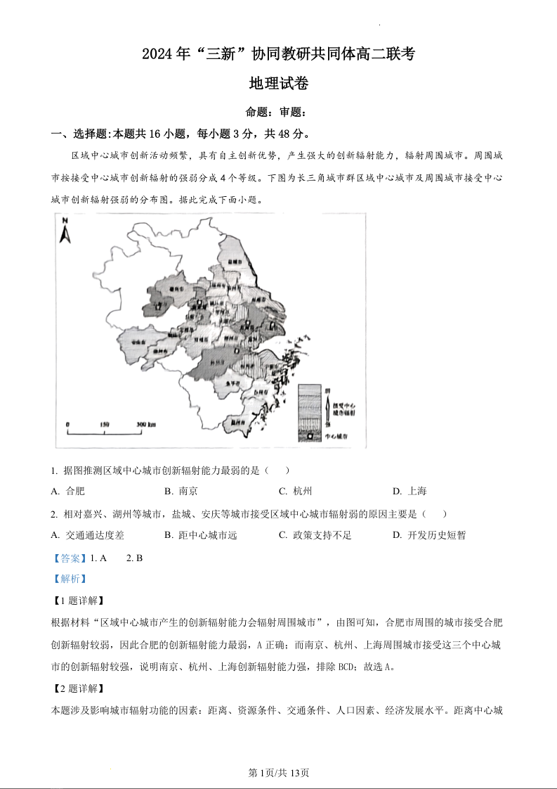 江西省三新协作体2023-2024学年高二下学期5月月考地理(精品解析版)