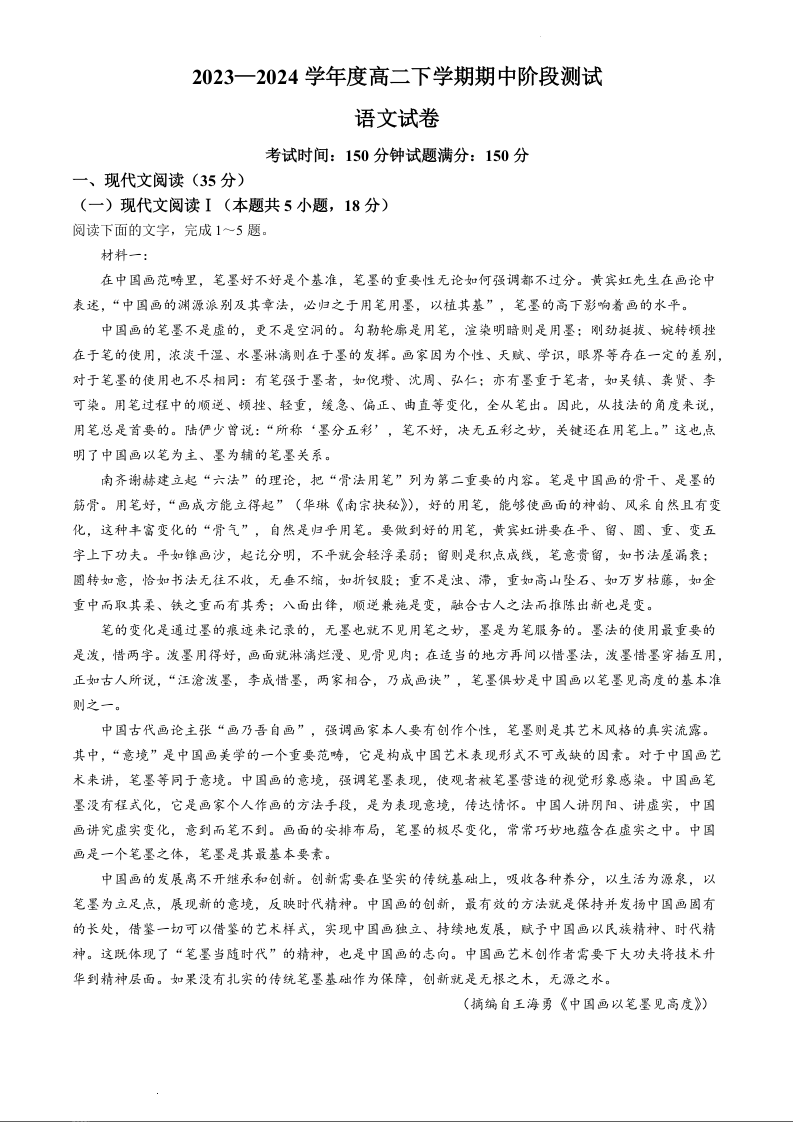 辽宁省实验中学2023—2024学年高二下学期期中阶段性测试试卷语文+答案