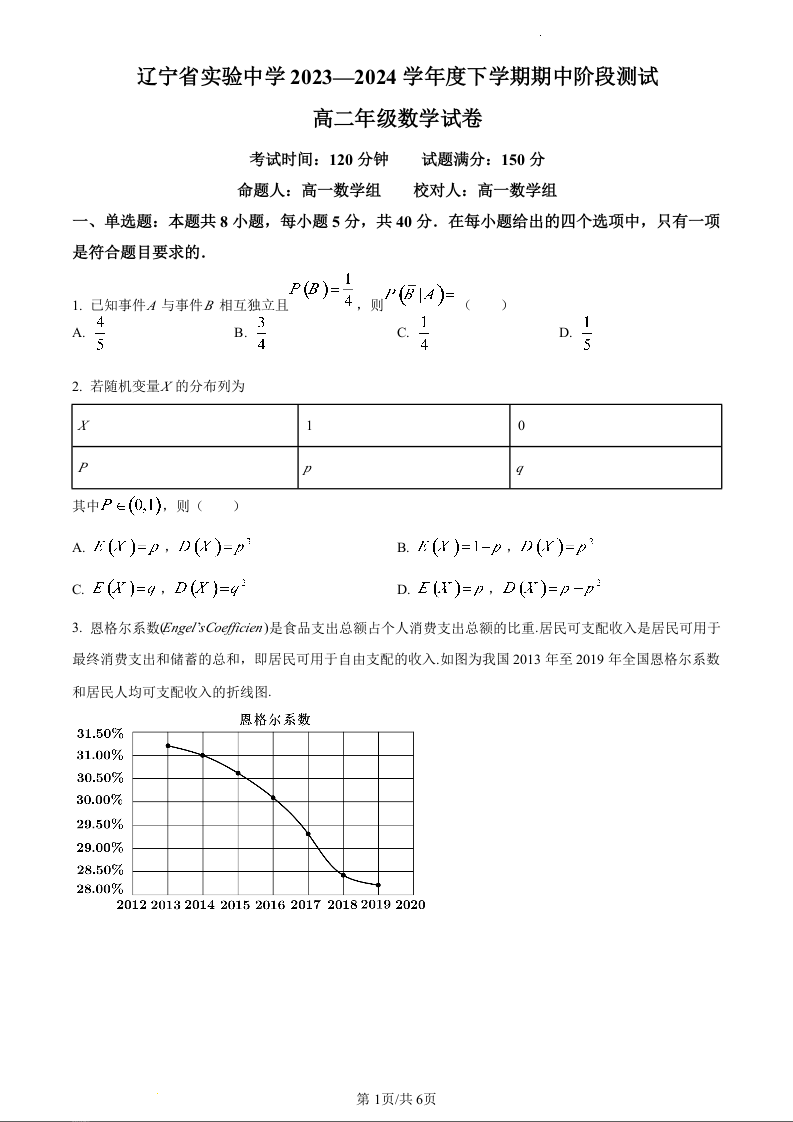 辽宁省实验中学2023—2024学年高二下学期期中阶段性测试试卷数学(原卷版)