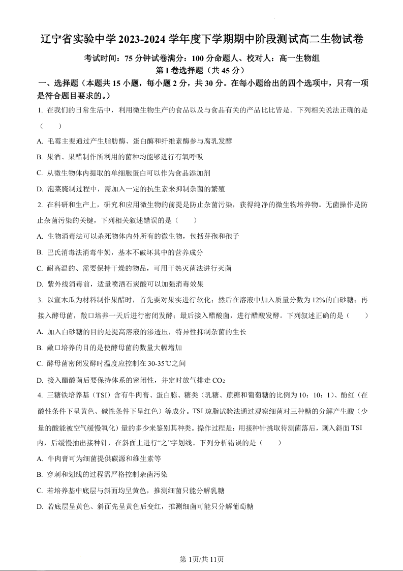 辽宁省实验中学2023—2024学年高二下学期期中阶段性测试试卷生物(原卷版)