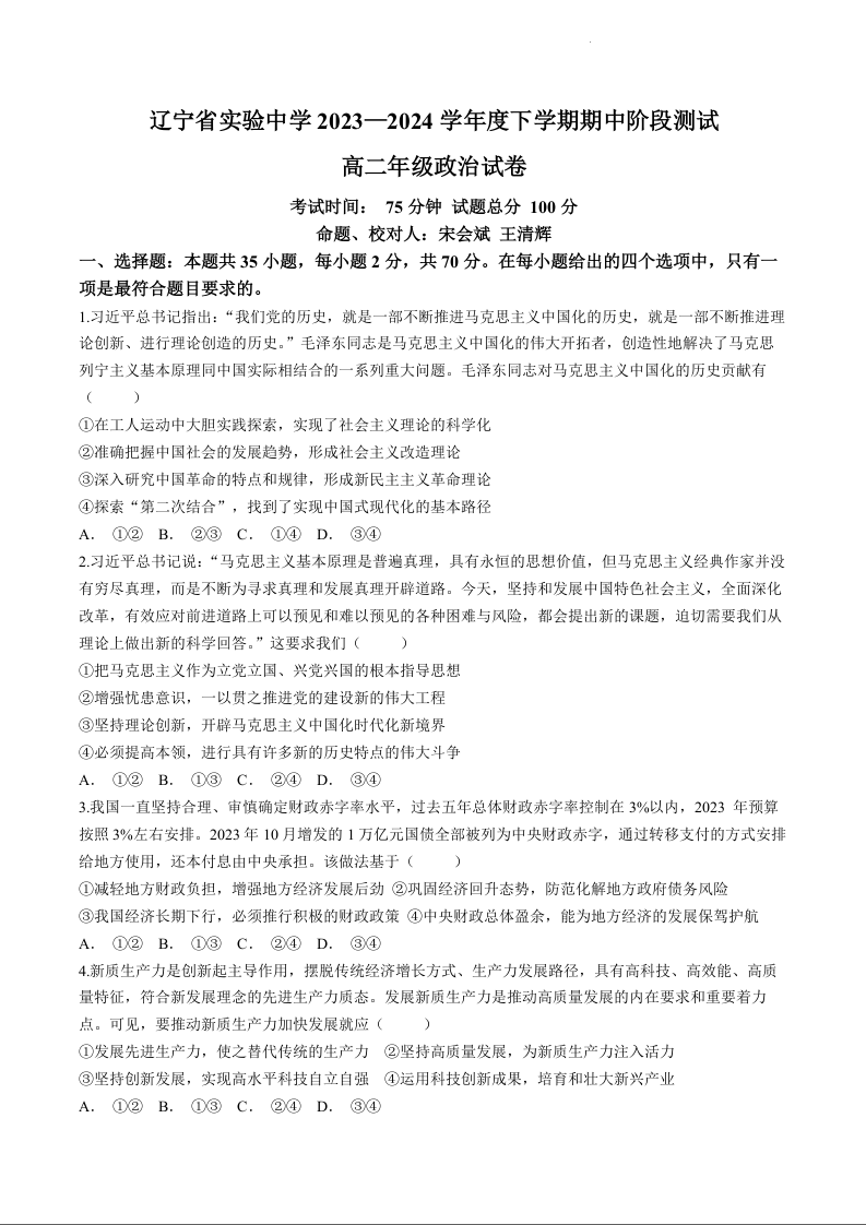 辽宁省实验中学2023—2024学年高二下学期期中阶段性测试试卷政治+答案