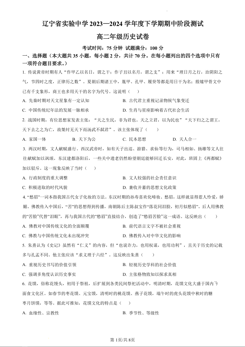 辽宁省实验中学2023—2024学年高二下学期期中阶段性测试试卷历史(原卷版)