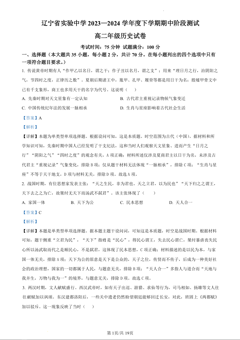 辽宁省实验中学2023—2024学年高二下学期期中阶段性测试试卷历史(精品解析版)
