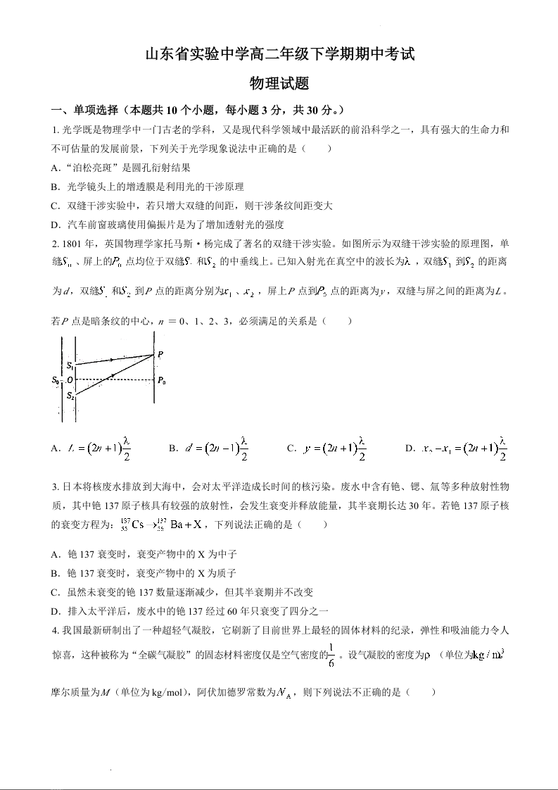 山东省济南市省实验中学2023-2024学年高二下学期5月期中考试物理+答案