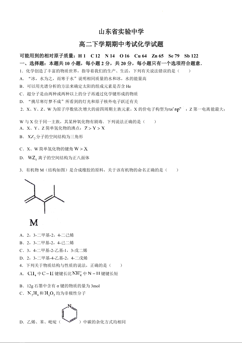 山东省济南市省实验中学2023-2024学年高二下学期5月期中考试化学+答案