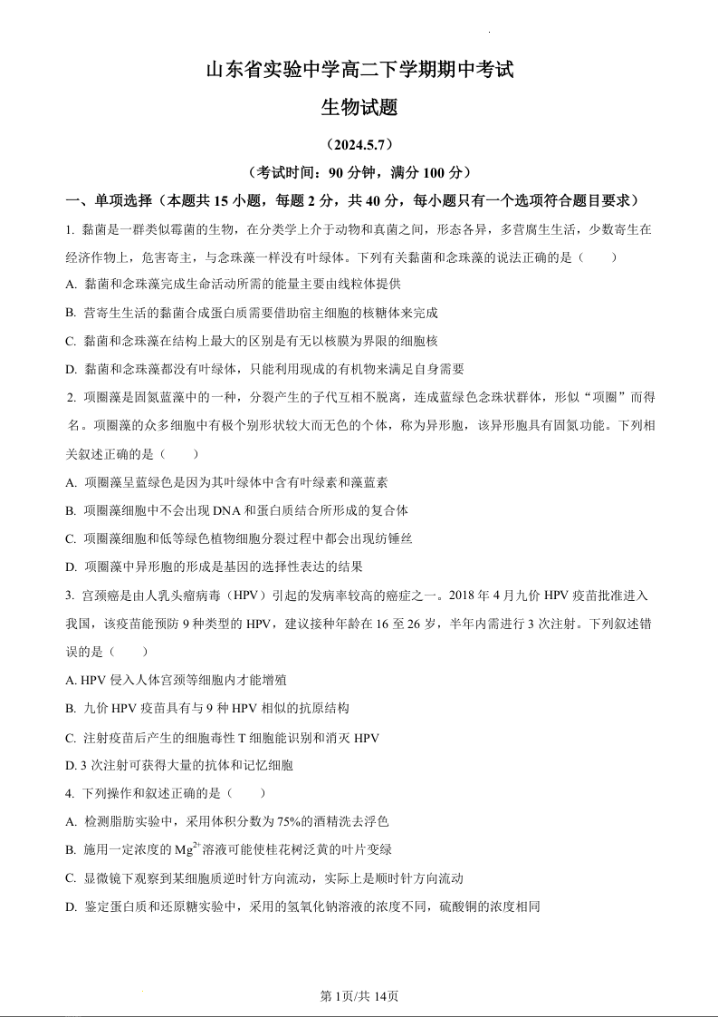 山东省济南市省实验中学2023-2024学年高二下学期5月期中考试生物(原卷版)