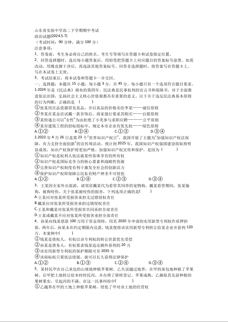 山东省济南市省实验中学2023-2024学年高二下学期5月期中考试政治+答案