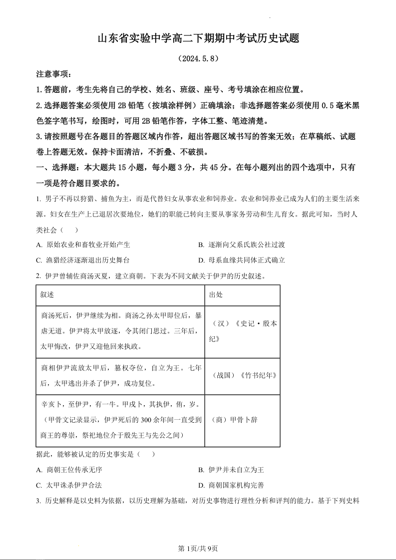 山东省济南市省实验中学2023-2024学年高二下学期5月期中考试历史(原卷版)